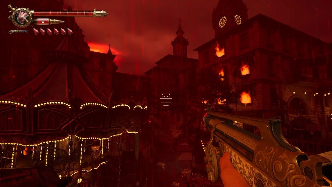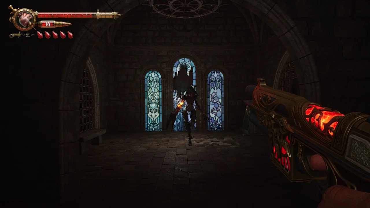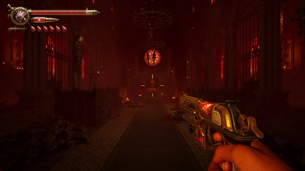 That blood-as-ammo system is the best mechanical hook in the game. Every reload costs health. Every shot carries a tiny sting of panic, especially in tense rooms where enemies are closing in and your bar is running low. Reloading is not a quick background action here. You hold the input, spikes bloom from these ornate weapons, and blood fills the chamber with nasty, stylish animation work. It looks incredible and instantly sells the fantasy.