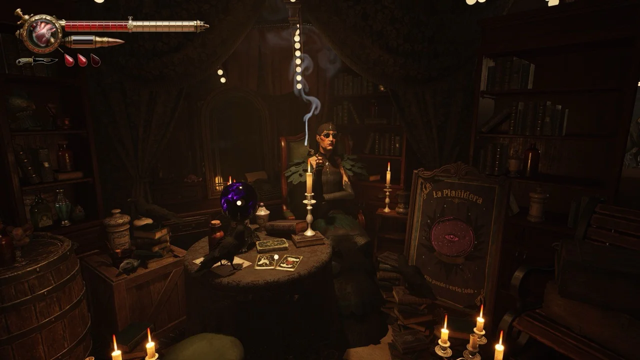 Presentation is where Crisol punches absurdly above its price. The Spanish gothic art direction is stunning. Religious iconography, rain-washed cough blood-soaked cough streets, carved architecture, and unsettling puppet design create a world that feels authored, not procedural. Tormentosa has identity.