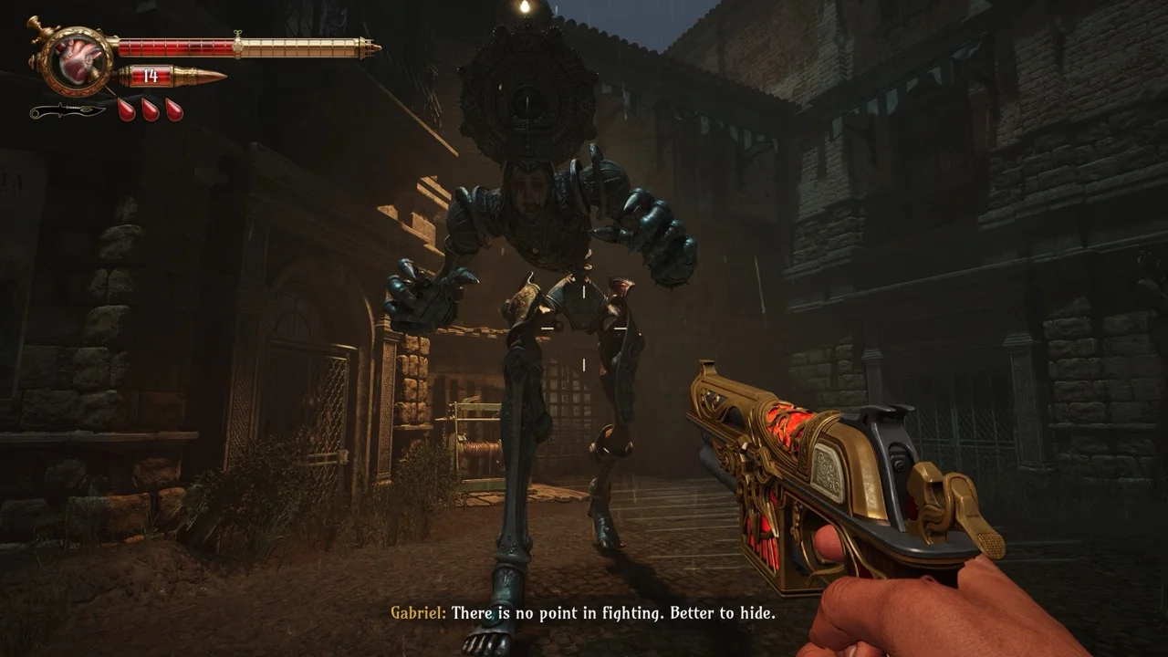 Set in Tormentosa, a grim, stormy, Spanish gothic nightmare, the game puts you in the boots of Gabriel, a captain and devout follower of the Sun God. He arrives in a city tied to rival worship of the Sea God, and things go bad fast. After a brutal early death at the hands of a towering mechanical horror, Gabriel is brought back with a divine gift, or curse, depending on how you read it. His weapons now feed on his own blood.